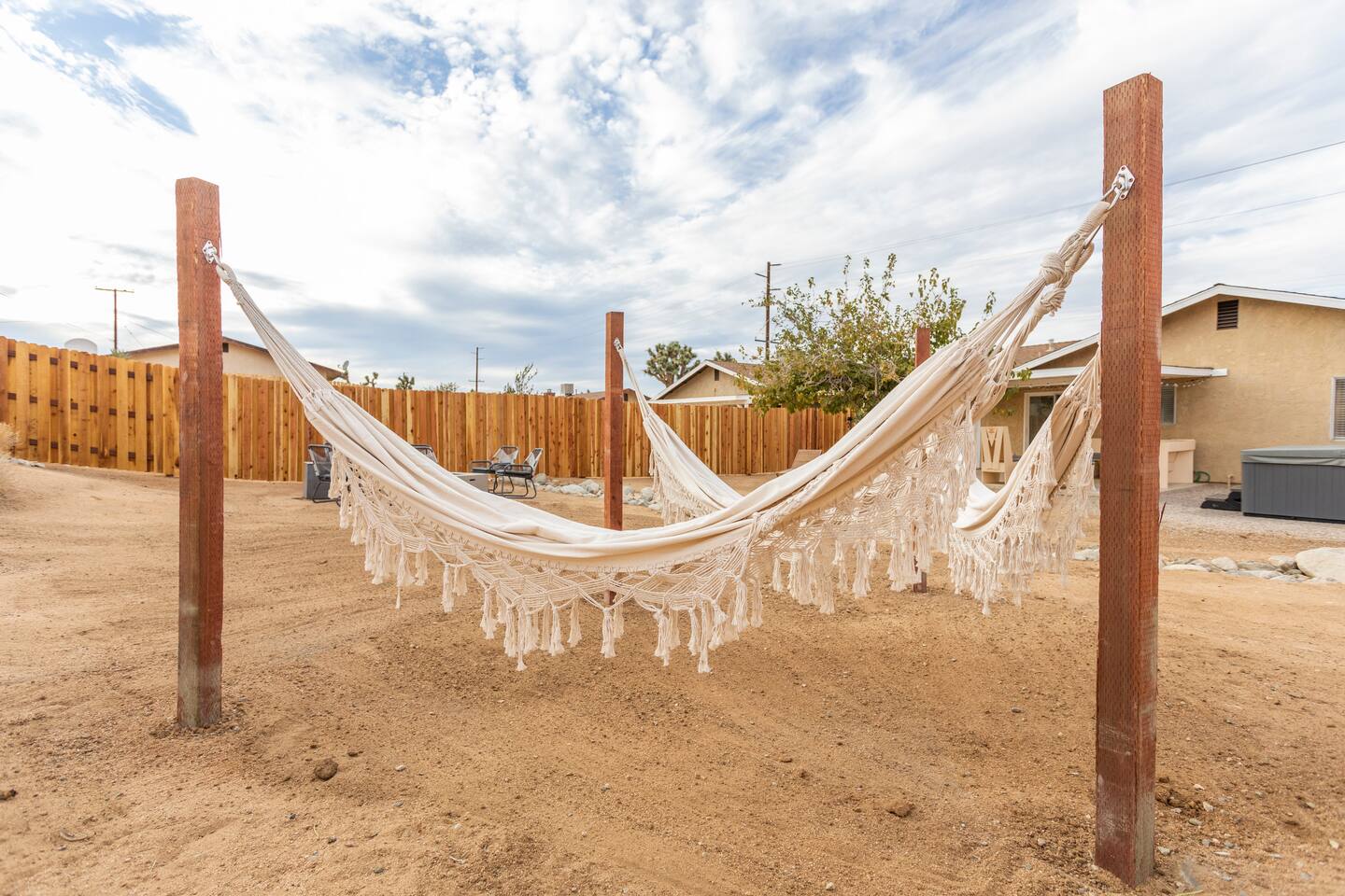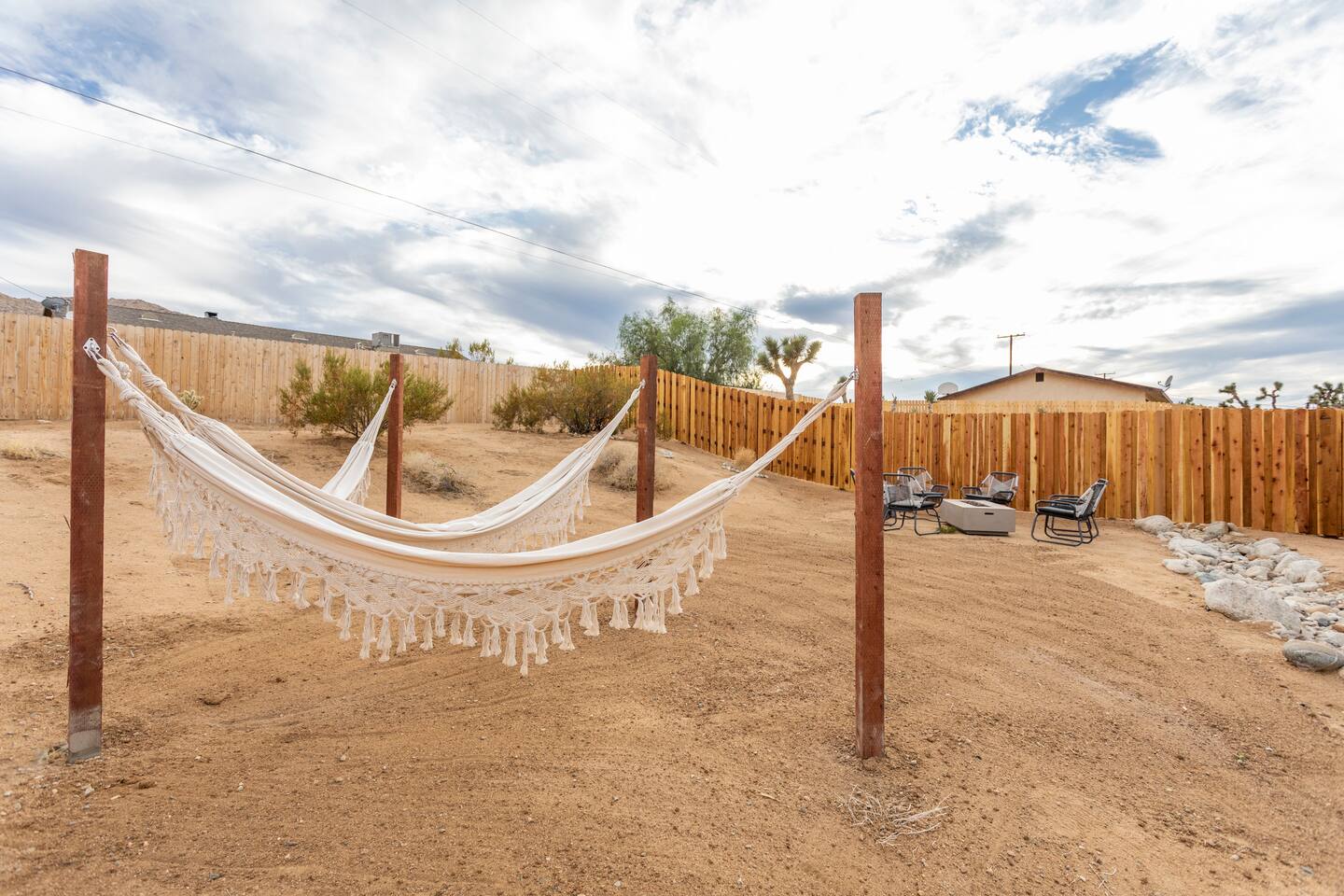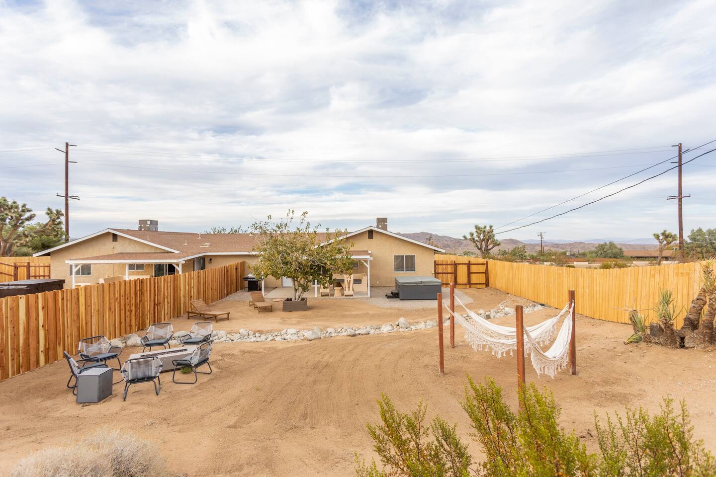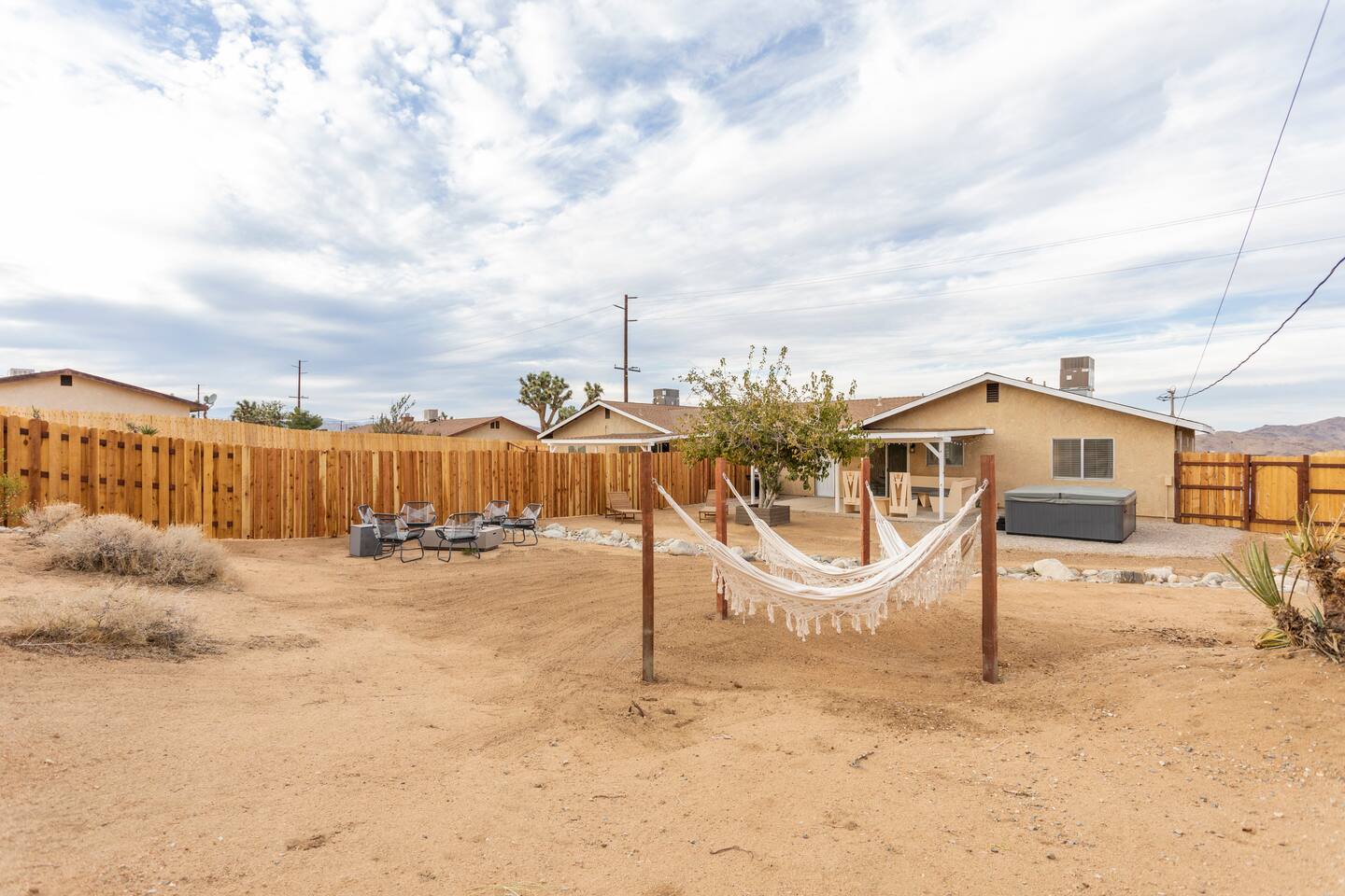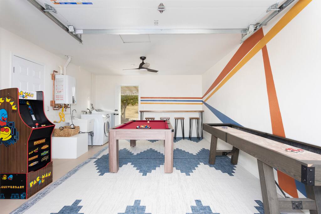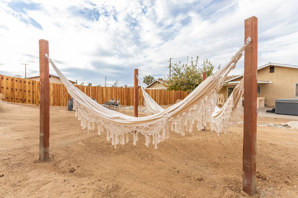 The ideal spot! This duplex home, private game room, lazy hammocks, new memory foam mattresses, and beautiful touches make this home THE place for your getaway in Joshua Tree. The game room is stocked with pool, ping pong, shuffleboard, and Pac Man. Think of the memories that are waiting to be made! The backyard has been transformed into a private oasis. Refresh with a soak in the hot tub, star gaze from macrame hammocks, sit by the fire pit, and grill up dinner on the BBQ grill. These details are what create an incomparable experience.