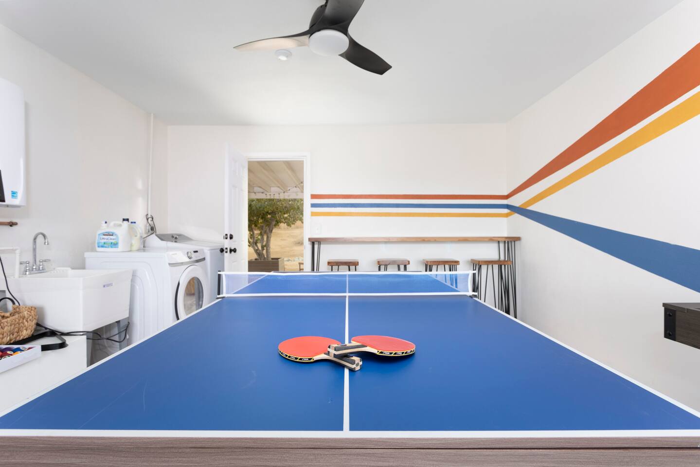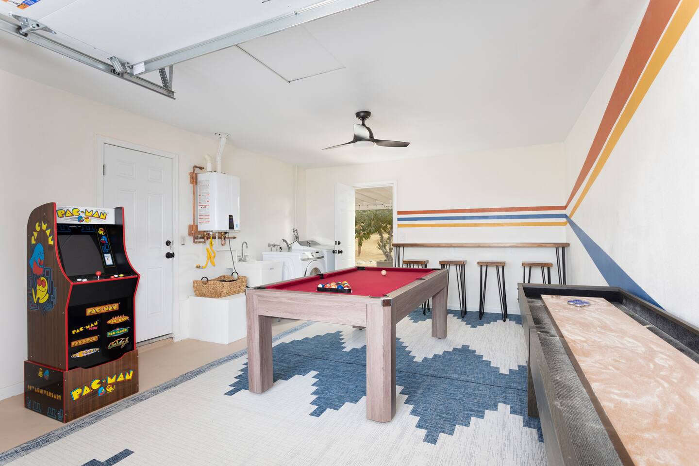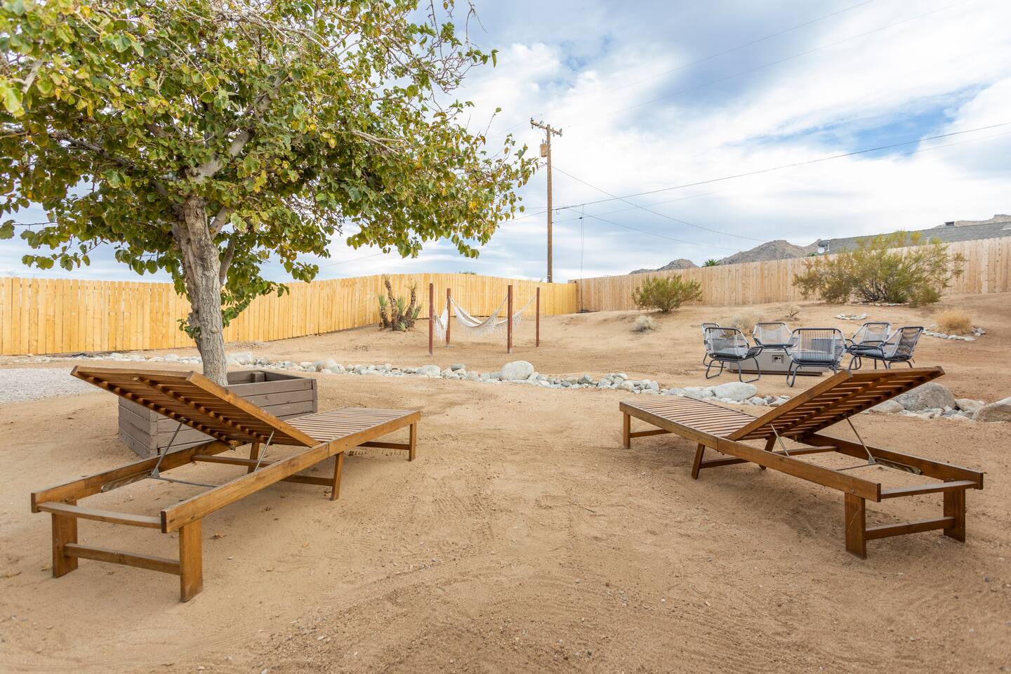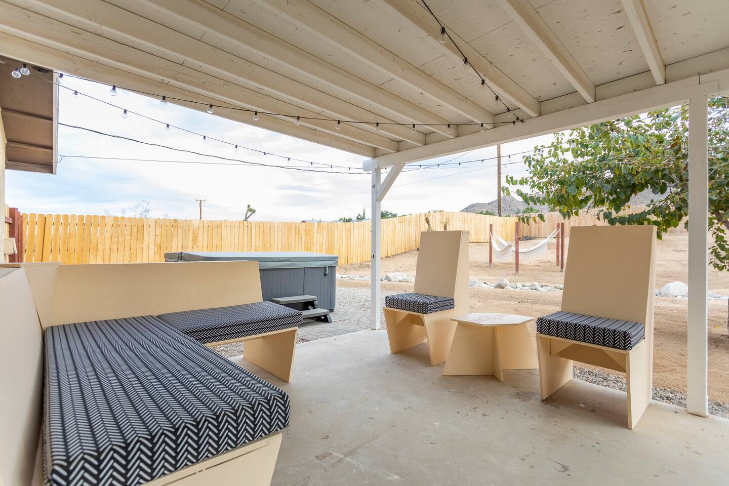 The ideal spot! This duplex home, private game room, lazy hammocks, new memory foam mattresses, and beautiful touches make this home THE place for your getaway in Joshua Tree. The game room is stocked with pool, ping pong, shuffleboard, and Pac Man. Think of the memories that are waiting to be made! The backyard has been transformed into a private oasis. Refresh with a soak in the hot tub, star gaze from macrame hammocks, sit by the fire pit, and grill up dinner on the BBQ grill. These details are what create an incomparable experience.